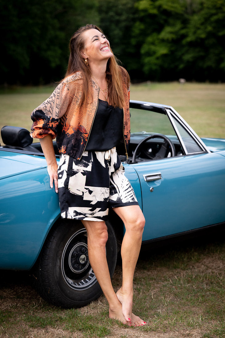 Limited edition hand printed silk shorts in a new SD design in two lengths. Screen printed by Sophie in our studio and hand-made in Brighton. This edition is ready to ship.