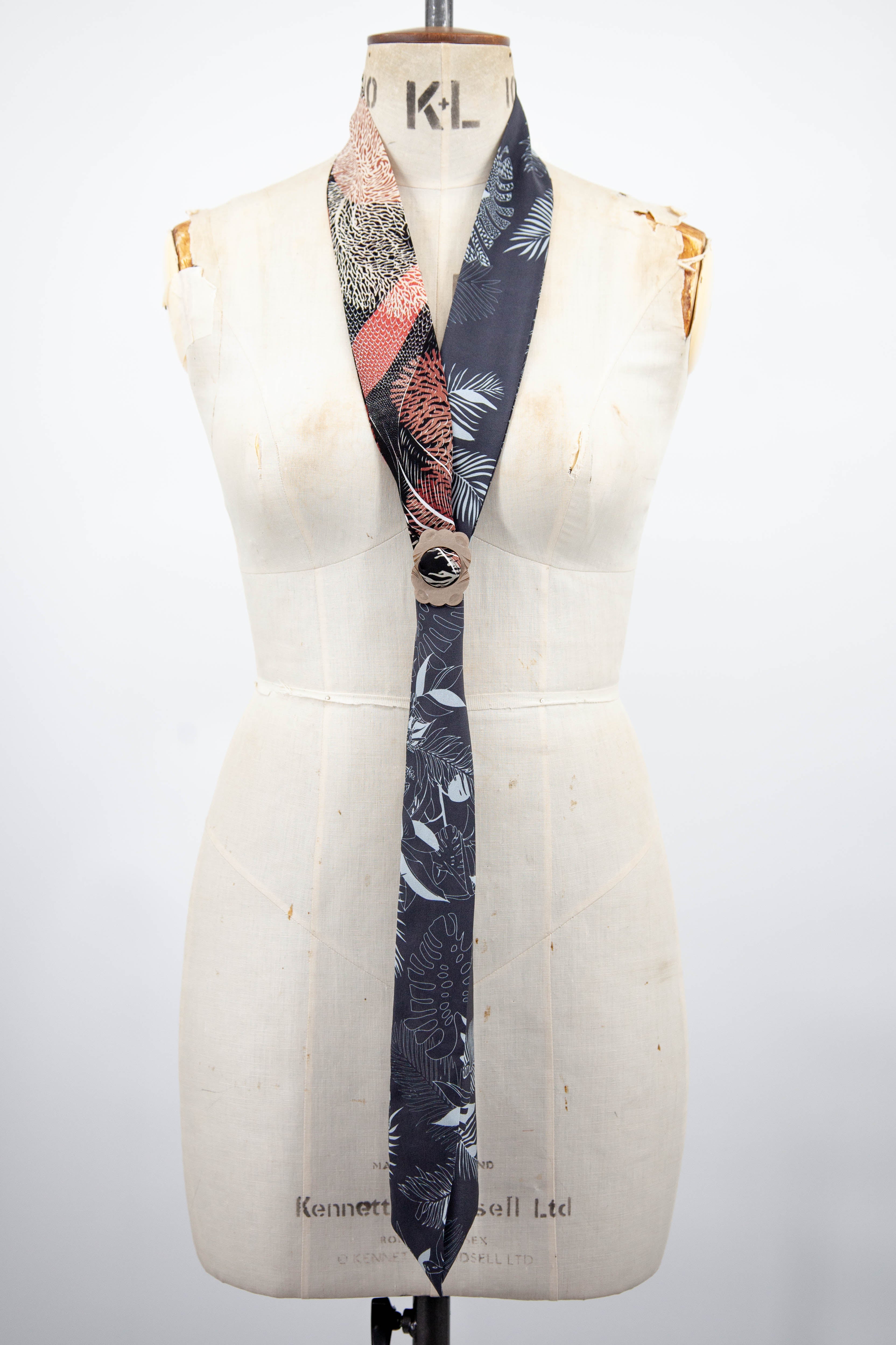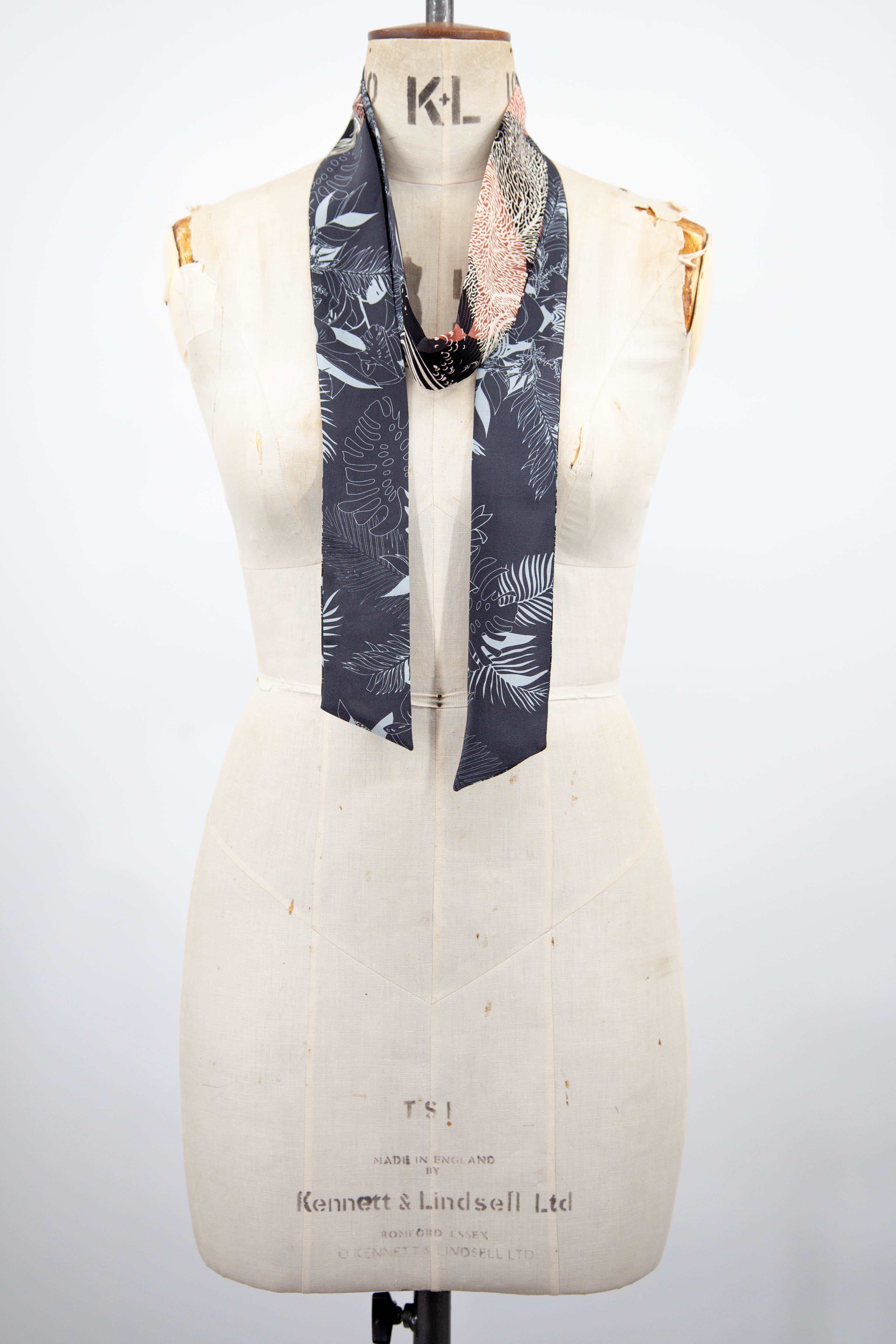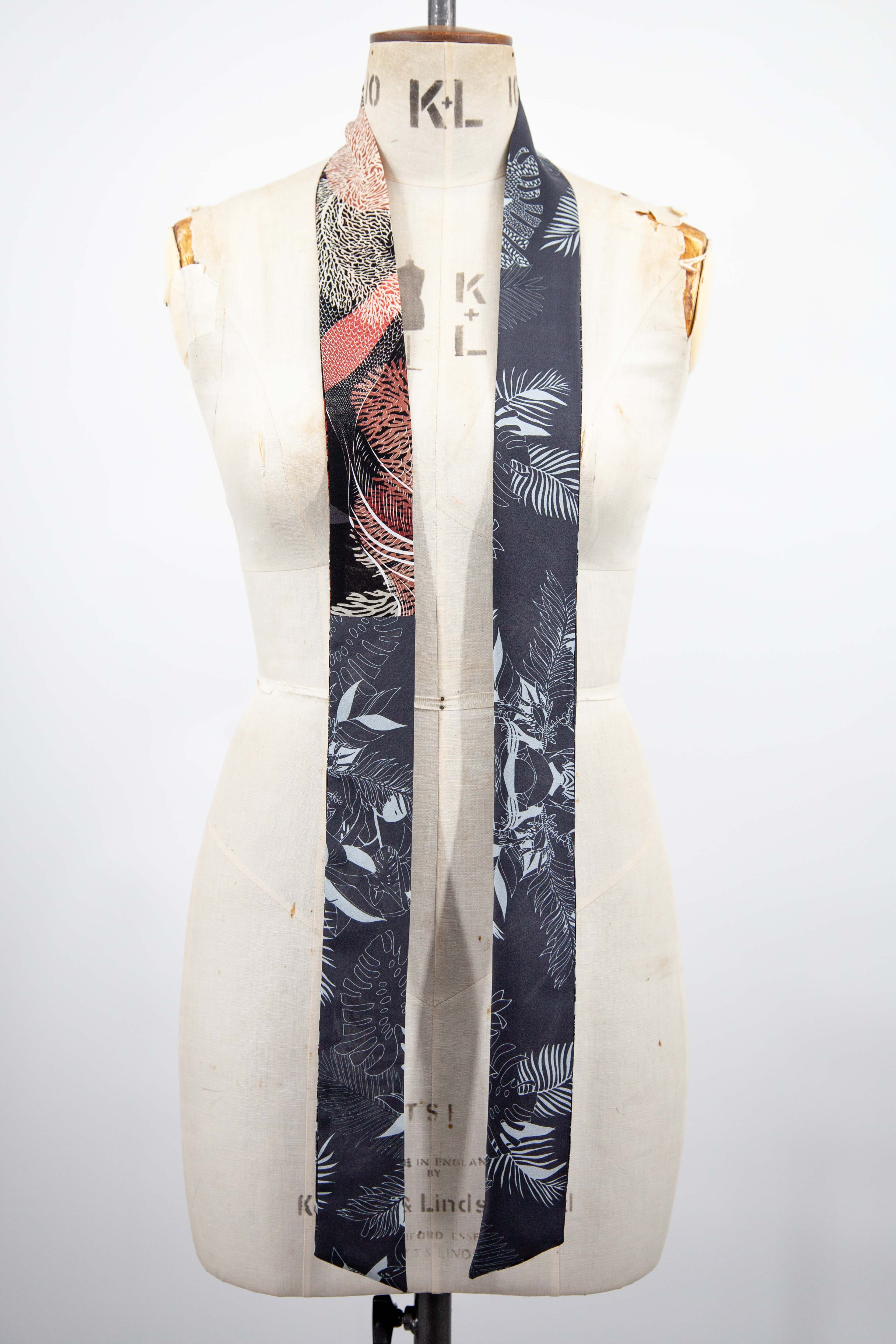 Colourful silk skinny scarf, made from printed silk and sewn in our Brighton studio. Carefully pieced together from our bomber jacket silk offcuts.