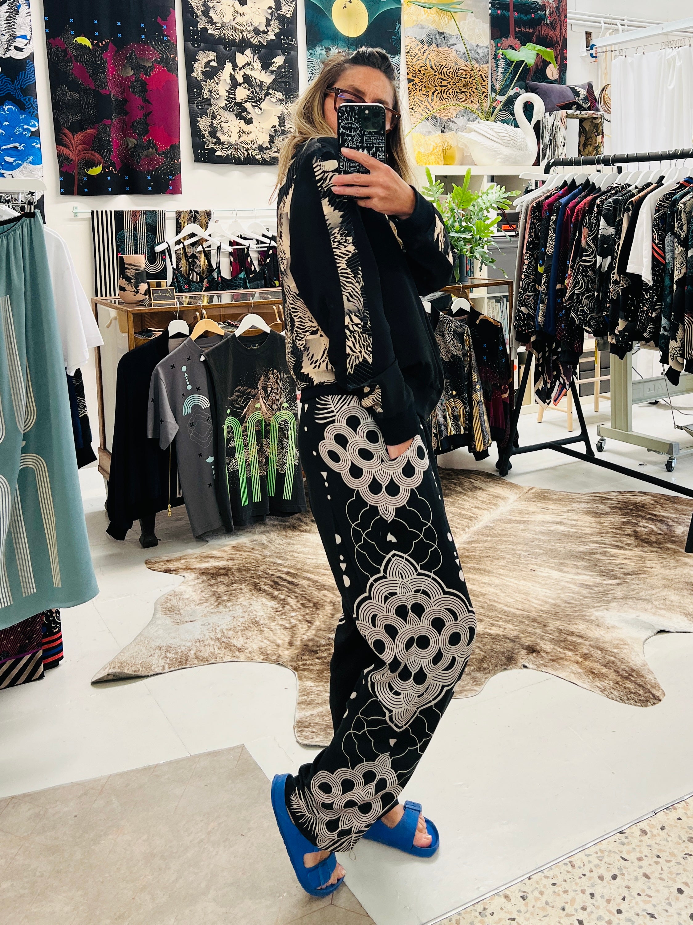 Introducing our brand-new hand-printed trousers in a stunning black. These ultra-soft, relaxed-fit trousers are a must-have addition to your autumn/winter wardrobe, designed to keep you comfortable and stylish.