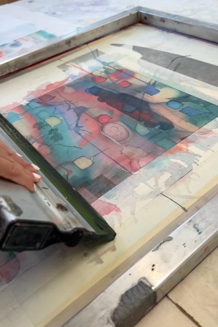 Use a squeegee to transfer painted designs onto paper or fabric